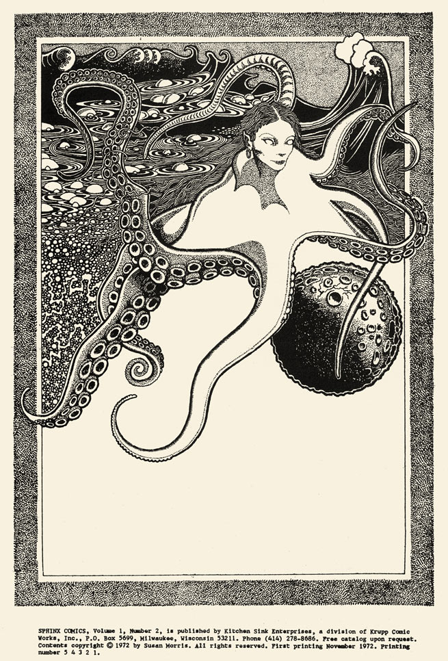Kitchen Sink printed approximately 10,000 copies of this comic book. It has not been reprinted. Both issues of Sphinx are copyrighted by Susan Morris, who I have heard was John Thompson's girlfriend at the time. I'm not going to speculate about why Thompson allowed his girlfriend to copyright the books, but I presume that everything worked out in the long run and all rights to the books reverted back to Thompson.