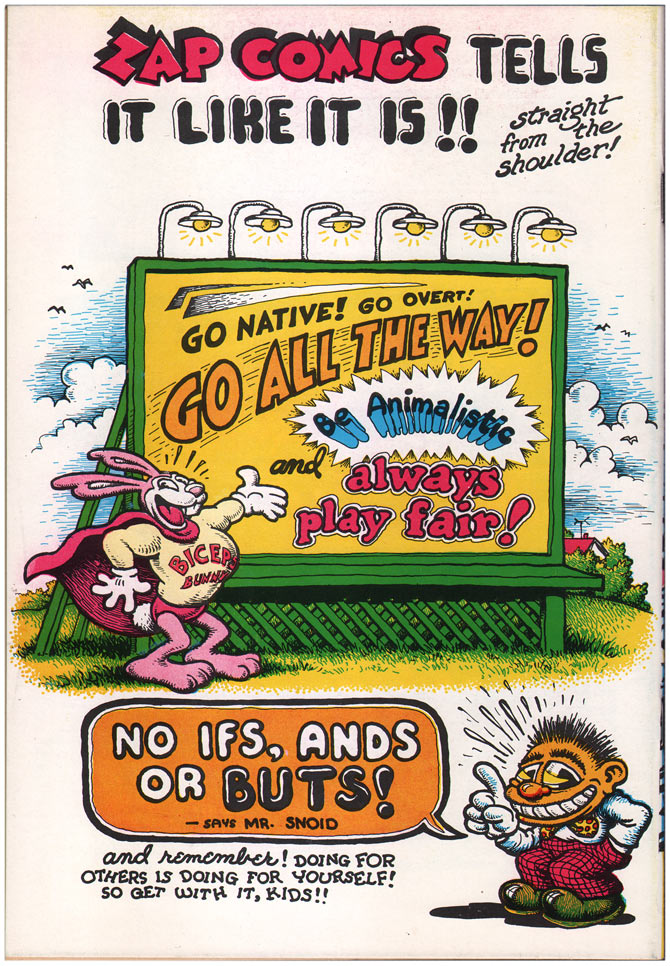 Zap #2. His opening five-pager, "Hamburger Hi-jinx," is typical early Crumb, with well-crafted panels of whimsical characters and a touch of surrealism. A few pages later, "Angelfood McSpade" depicts the central character as a sexually insatiable African junglewoman. It's one of Crumb's earliest masturbatory fantasy cartoons, which he would never grow tired of, and it once again pushes a racist stereotype right up under the noses of his audience, but outside of the racist context his story could be construed as "cute."